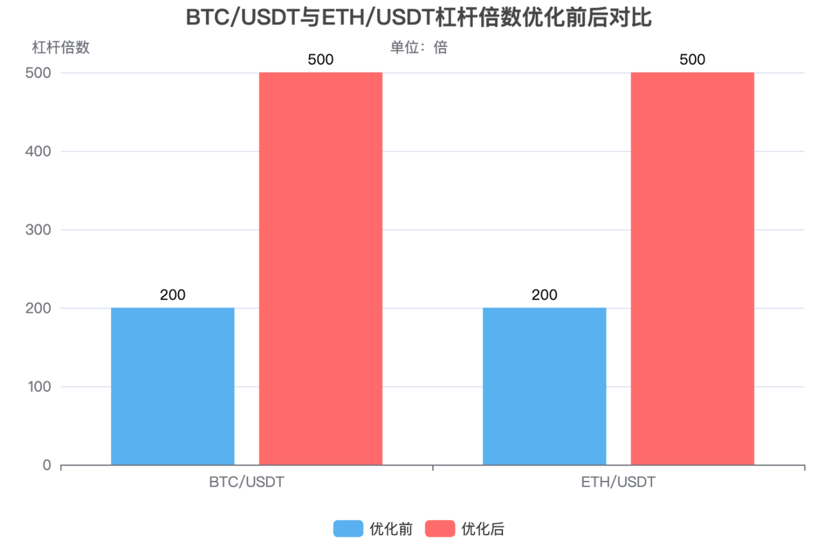 为了更直观地展示此次调整的影响,我们可以通过图表来对比优化前后的杠杆倍数变化情况。下图清晰地对比了BTC/USDT和ETH/USDT在优化前后的最大杠杆倍数。